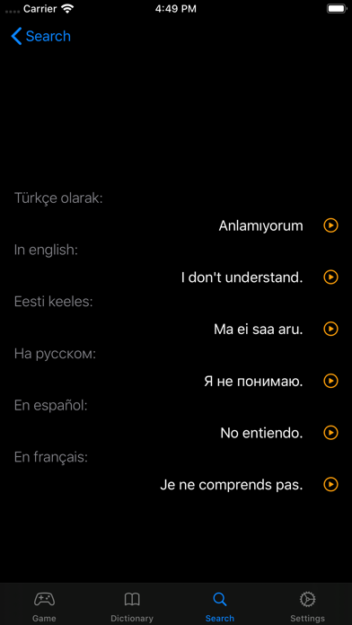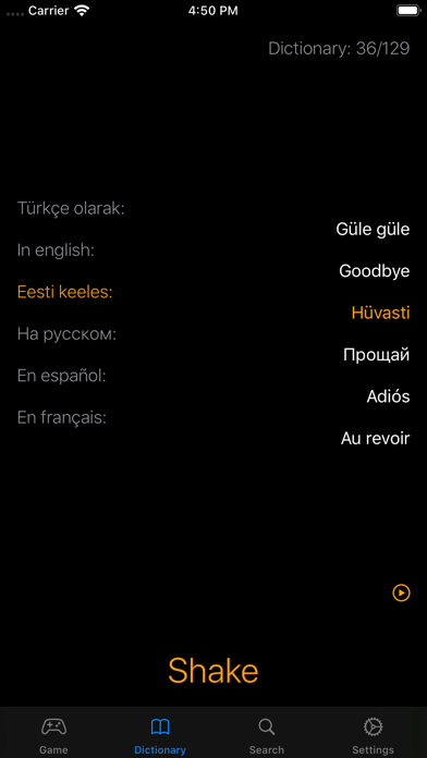 Learn new Estoninan words and phrases in a game manner. A word or phrase is accompanied by three different versions in English. Your task is to learn a new word in a repetitive manner. For a quiet study, the game is accompanied by emerging hints. When studying Estonina, you will fill up a vocabulary of English words. Tips are accompanied by duplicated words in English, Estonian, Russian, Turkish, Spanish and French languages. This is a great way to start a couple more new languages. All phrases and words provided by Estonian voice. Just shake your phone to get new phrase and sound will play automatically