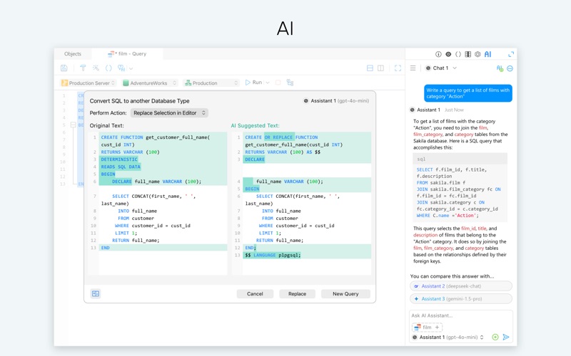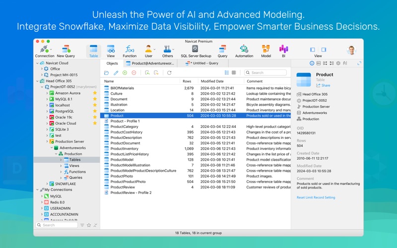 Navicat Premium is a robust, all-in-one solution for database development that enables seamless connections to multiple databases, including MySQL, PostgreSQL, MongoDB, MariaDB, SQL Server, Oracle, SQLite, Redis, and Snowflake, all from a single application. Its native user interface delivers a streamlined experience, making database design, management, and maintenance easier than ever. Whether you're executing complex queries, performing data migrations, aligning data models with databases, or leveraging powerful business intelligence tools for insightful analysis, Navicat Premium provides the essential tools for optimal database performance and increased productivity. Data Viewer View, update, and delete records in Grid View or Form View with our built-in editors. Integrate a data profiling tool for visual data analysis and interact with charts for deeper insights. Object Designer Manage database objects through a responsive interface that simplifies query writing into structured tabs, enabling more confident and accurate complex queries. Query Edit Accelerate your coding process with Code Completion and Code Snippet, and gain valuable insights into query-database interaction by visualizing the execution plan. You can also visually construct queries using a set of interactive tools. AI Assistant Ask questions for instant answers and enhance your queries by providing context about your database or schema. The AI Assistant provides relevant information based on your structure, and you can even compare answers from different AI models. Ask AI Customize and pin your favorite AI actions for instant workflow optimization. It includes built-in tools to explain, tune, and format SQL, plus instant suggestions to fix errors, improving code quality. Migration Data Transfer, Data Synchronization, and Structure Synchronization streamline data migration with reduced overhead. They offer step-by-step guidelines for transferring data between databases, enabling quick comparisons and synchronizations, along with detailed scripts that outline your desired changes. Model Convert your databases into graphical representations and build multiple models in a single workspace using Relational, Dimensional, and Data Vault 2.0 methods. Align your designs with the actual database to ensure model integrity and enhance navigation and understanding of complex systems. BI Visualize large data sets to uncover patterns and trends, and present your findings in an interactive dashboard. In this dashboard, all charts are interconnected, so actions on one chart instantly update others. Import and Export Import data from various formats or ODBC, and export data from tables, collections, views, or query results to popular formats like Excel, Access, and CSV. Data Generator Generate a wide range of quality testing data quickly, creating realistic data sets with referential integrity based on business rules and constraints. Collaboration Sync your connection settings, queries, aggregation pipelines, snippets, model workspaces, BI workspaces and virtual group information to the cloud service for real-time access and easy sharing with coworkers anytime, anywhere. Other useful features: - Data dictionary - Navicat URI - ER diagram view - Table and collection profile - Text, hex, image, web or BFile viewer and editor - Object filter - Query pinned result - SQL beautifier - Debugger for Oracle and PostgreSQL - Connection coloring - Virtual grouping - Backup and restore - Aggregation pipeline for MongoDB - Schema analysis for MongoDB - Tree View and JSON View for MongoDB - Pub/Sub for Redis - Automation - User privilege manager - Server monitor - Command monitor - Focus mode - Dark mode Note: Try Navicat free for 14 days with full app access. Your trial will automatically convert to a paid subscription unless canceled 24 hours before it ends. Terms of Use: https://www.navicat.com/manual/online_manual/en/navicat_17/mac_manual/#/license_agree