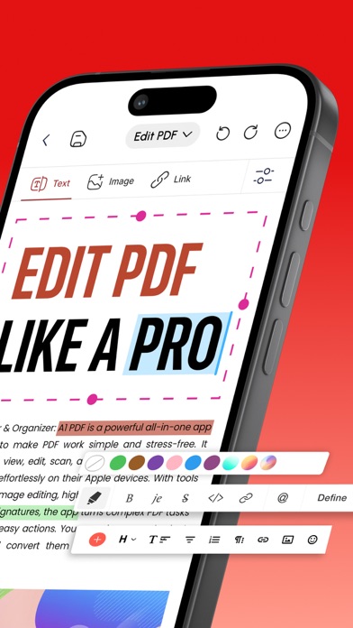 Edit, Read, Scan, Convert, Annotate & Sign Your PDF Documents With A1 PDF EDITOR! A1 PDF EDITOR is your all-in-one PDF converter, reader and editor app. It allows you to view, scan, edit, annotate, convert, draw and sign PDFs, allowing you to handle your important documents in an easy, breezy and safe way! KEY FEATURES: → PDF EDITOR: Edit & Annotate Documents Easily: • Edit PDF, write, annotate and leave comments easily on your doc with our customizable sticky notes and intuitive drawing tools. • Highlight key passages, add text boxes for in-depth comments, and respond to existing annotations. (Apple Pencil support on iPad Pro for enhanced precision). → PDF READER: View & Read PDF Documents: • Received a document you need to view and read? Our app lets you view any type of document which is easy to read with our high quality PDF opener app. → PDF SCANNER: Scan Physical Documents: • Scan your physical documents and convert them into universally readable documents using your phone’s camera. • Our advanced scanning technology ensures your scanned PDFs look professional with automatic perspective correction, color adjustments, and intelligent cropping tools. → PDF CONVERTER: Convert to PDF from different Documents: • Word Document → PDF • Excel Spreadsheets → PDF • Presentations → PDF • Images (JPG, PNG) → PDF • Plain Text (TXT) → PDF → PDF to FILES: Convert PDF to any document easily: • PDF → Word Document • PDF → Excel Spreadsheets • PDF → Presentations → PDF SIGNATURE: Sign Documents Without Hassle: • Fill out your forms and sign without any hassle using your finger or Apple pencil. • Our electronic signature system makes sure your original signatures look just as good and accurate on your PDF documents. → SHARE & EXPORT & COLLABORATE: • Invite colleagues or clients to collaborate by effortlessly sharing PDF files via email, link, or text message. • Set permission levels for recipients, allowing them to view, edit, or sign the PDF document according to your needs. • Print, fax, or convert any doc to PDF - Word, Excel, and PowerPoint formats for maximum flexibility → MORE TOOLS: • Insert Images & Draw Effortlessly • Unleash your creative side by inserting images, editing images and using our multiple PDF tools to draw and beautify your documents. Why Should You Choose A1 PDF EDITOR? • Compatible With All Apple Devices - iPhone (iOS 15.0 or later), iPad (iPadOS 15.0 or later), Mac (macOS 12.0 or later and a Mac with Apple M1 chip or later) • All In One PDF App - No need to download multiple apps to scan, edit, convert, or annotate docs; this one app allows you to do it all effortlessly! • Work Offline - Fluctuating internet? No need to panic! Work offline and the changes will be synced as soon as you are back online :D • Free Premium Trial - Unlock the Full Potential with a Free Trial. Experience all the premium features of A1 PDF EDITOR free for 3 days! Choose a subscription plan that best suits your needs and cancel anytime without obligation. Please note: Subscriptions are charged through your App Store account. Subscriptions automatically renew unless canceled at least 24 hours before the end of the current period. Manage your subscription through your App Store account settings after purchase. What are you waiting for? No need to download multiple PDF apps. Make your life easier with the A1 PDF EDITOR today! Terms of use - https://blog.a1apps.co/terms-of-use-a1-pdf-editor/ Privacy Policy - https://a1office.co/ios-privacy-policy/
