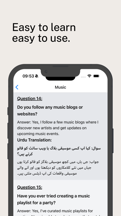 Key Features: 1. 6 Topics: Music, Entertainment, Special Occasions, Recent Personal Experiences, Means of Transport 2. Grade 5 Language 3. Urdu Translations 4. Audio Support 5. 2 Sample topics to give you some inspiration for the topic form. Introducing the essential tool for mastering the Grade 5 B1 test required for UK visas - our comprehensive app designed to elevate your preparation and ensure success. With a focus on the six crucial topics - music, entertainment, special occasions, recent personal experiences, and means of transport - this app is your passport to proficiency. What sets us apart? We've meticulously crafted this app to cater to diverse language needs. Each topic is packed with sample questions and answers, precisely tailored to Grade 5 language function. But here's the game-changer - we offer Urdu translations alongside the English content, empowering Urdu speakers to grasp the nuances effortlessly. What's more? Experience convenience at its finest - simply tap and listen to the questions and answers in English, enhancing comprehension and pronunciation skills. Main Features: 1. Six Crucial Topics: Music, Entertainment, Special Occasions, Recent Personal Experiences, Means of Transport. 2. Grade 5 Language Function: Sample questions and answers aligned with test requirements. 3. Urdu Translations: Seamless understanding for Urdu speakers. 4. Audio Support: Listen to questions and answers in English for enhanced comprehension by clicking on the English text in questions. 5. Comprehensive Preparation: Prepare confidently with meticulously curated content. 6. 2 Sample topics to help you prepare for the topic phase. Whether you're striving for visa success or aiming to boost your English proficiency, this app is your ultimate companion. Elevate your preparation, bridge the language gap effortlessly, and embark on your journey towards success with our Grade 5 B1 Test Prep App!