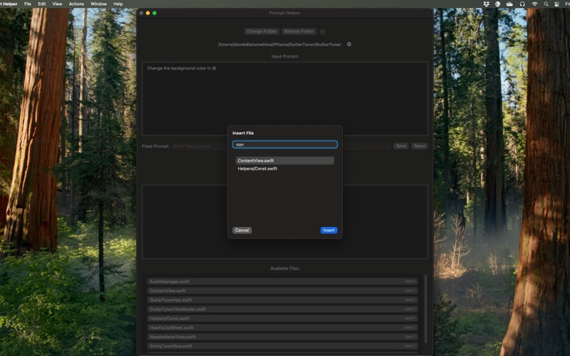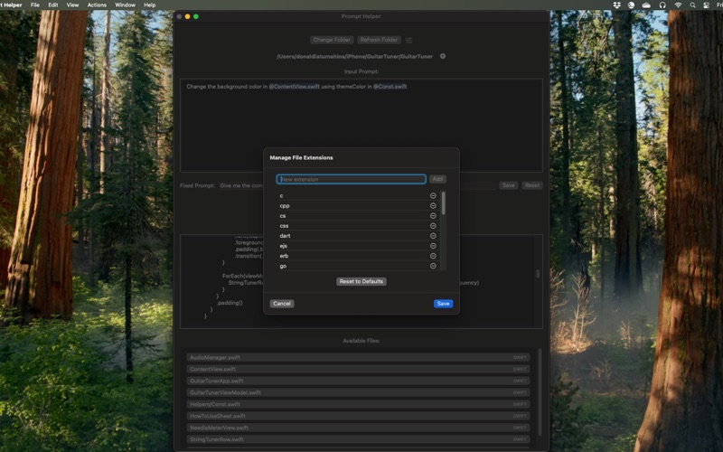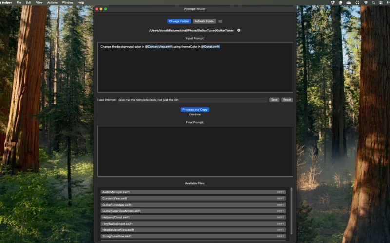 Prompt Helper takes the pain out of crafting coding prompts for tools like ChatGPT — especially when you need to include file contents as context. Instead of manually copy-pasting files one by one, just type your prompt and insert any file from your project using @filename or a keyboard shortcut. Prompt Helper automatically appends the full content of each file — no more jumping between files or messy copy-paste. FEATURES • Insert Files Instantly Type @ or use a shortcut to insert one or more files into your prompt. Their contents are included automatically — no manual copy-paste needed. • Process and Copy in One Step Write your prompt, hit ⌘⏎ (Cmd-Enter), and your complete prompt — with all file content — is copied to your clipboard, ready for ChatGPT or any LLM. • Fixed Prompt Option Add an instruction that’s always included (like "Respond with a unified diff" or "Use TypeScript") so you don’t have to repeat it every time. • Customizable File Extensions Easily manage which file types are available for insertion. • Simple and Focused Interface Designed specifically for crafting coding prompts — no distractions, no extra clutter. • Fast. Local. Private. Runs entirely on your Mac. Nothing is uploaded or shared — your code stays private.